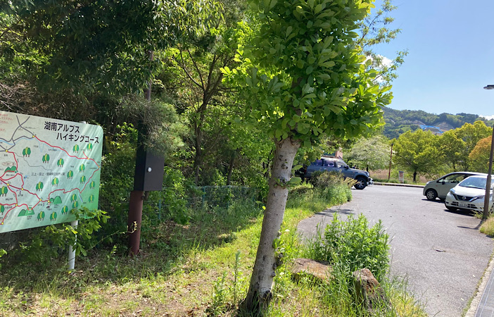 田上公園駐車場(無料)。綺麗なトイレもあります。マイカーで来るのであれば、ここの駐車場が一番良さそう。10時前ごろに通りかかった際は満杯でした。この先の登山口近くの林道にも数カ所停める場所はありますが、せいぜい1〜2台程度。そしてすでに利用されていました。登山日和にマイカーで来る場合は早めの出発が必須ですね!