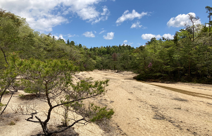 そして、この鎧堰堤の先が不思議な場所。地図上はダム湖となっていますが、ほとんど水はありません。前日に雨が降ったこともあり、カエルの元気な鳴き声がよく聞こえました。