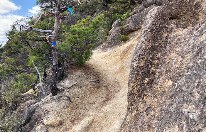 ピークに向けて、岩場が何ヶ所も出てきます。手や足をしっかり載せる場所があるので、個人的には怖さは感じませんでした。トラロープがかけられている場所もあります。